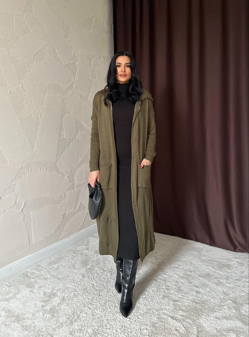 كاردجان طويل باللون الاخضر الزيتوني، مزود بقبعة وجيوب جانبية، مع تصميم عصري يتميز بكتابة بارزة على الظهر. القطعة مريحة وعملية، ومثالية للإطلالات الكاجوال اليومية.